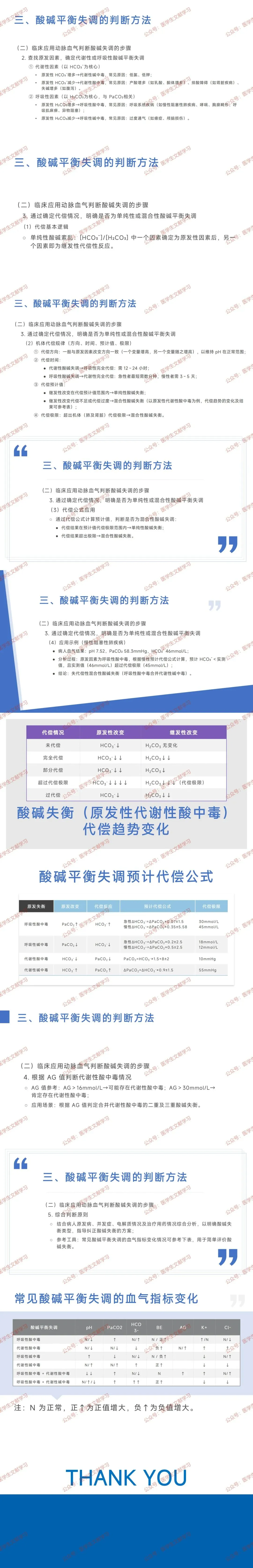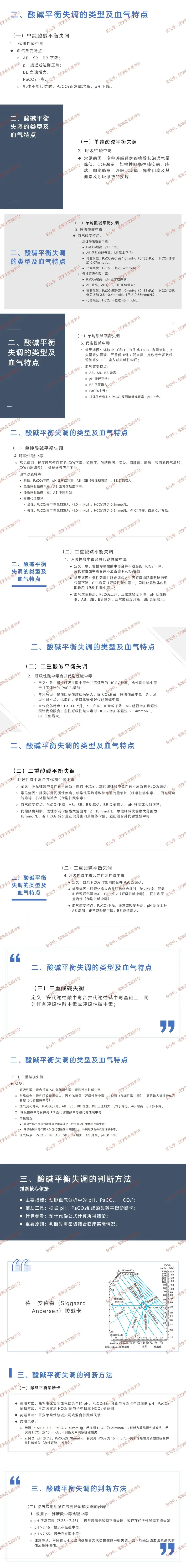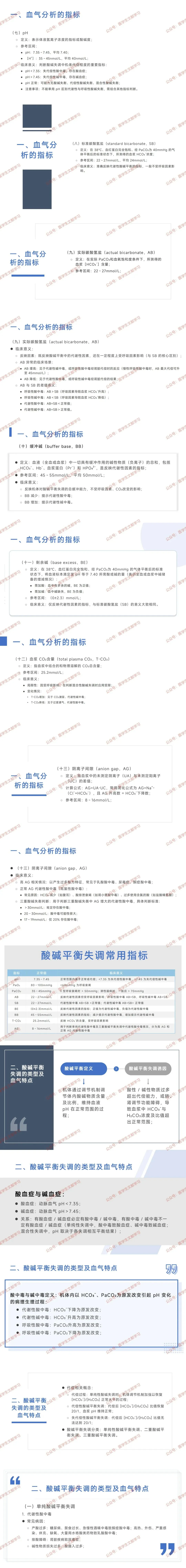 酸中毒与碱中毒:代谢性酸中毒(HCO₃⁻下降为原发改变)、代谢性碱中毒(HCO₃⁻升高为原发改变)、呼吸性酸中毒(PaCO₂升高为原发改变)、呼吸性碱中毒(PaCO₂下降为原发改变)。