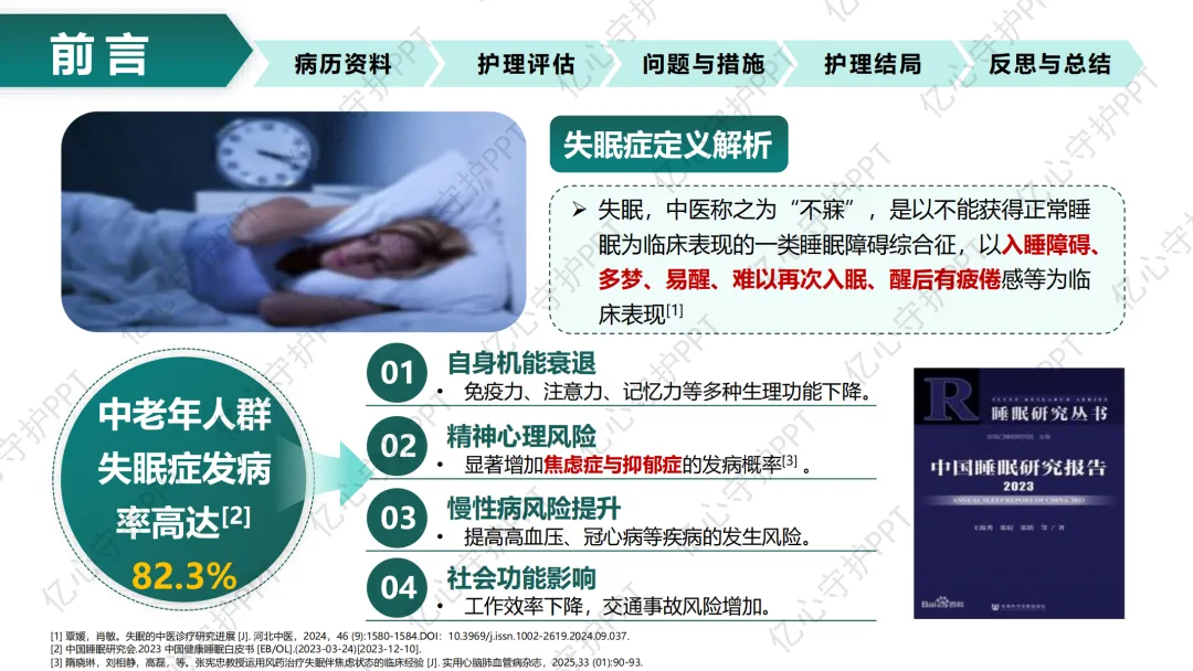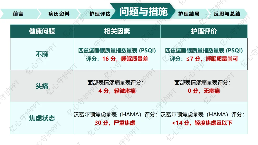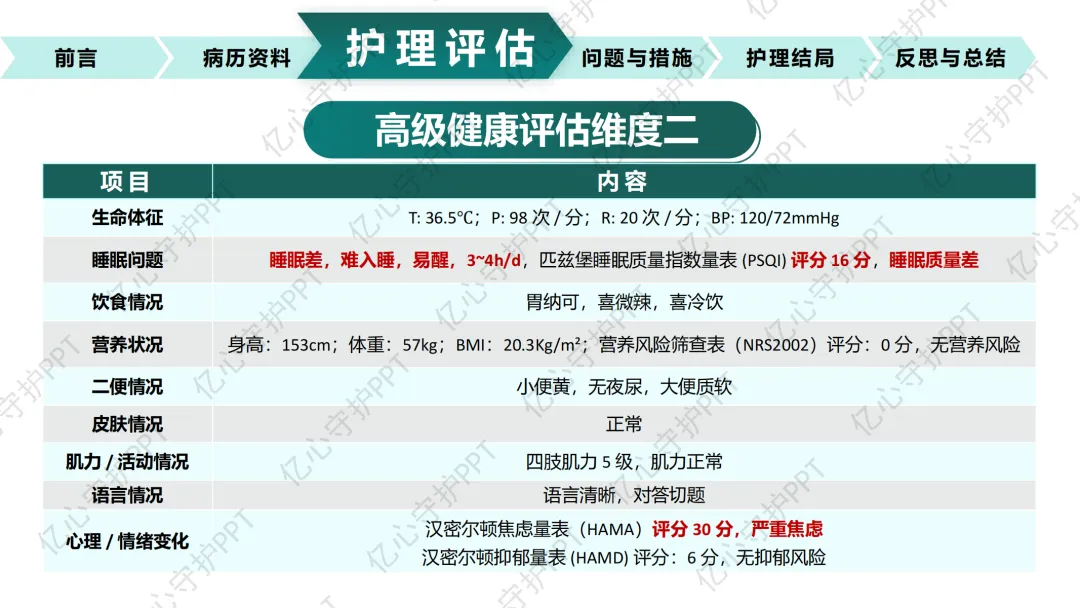 入睡困难,易醒,每天只能睡3-4小时。匹兹堡睡眠质量指数量表(PSQI)评分为16分(≥8分提示睡眠障碍),汉密尔顿焦虑量表(HAMA)评分为30分,提示存在严重焦虑。