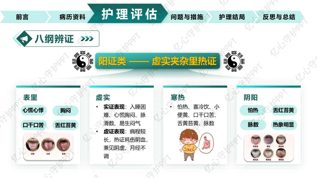 中医诊断为:不寐,肝火扰心证。同时伴有口干口苦、头晕头痛、心悸胸闷、舌红苔黄、脉滑数等表现。