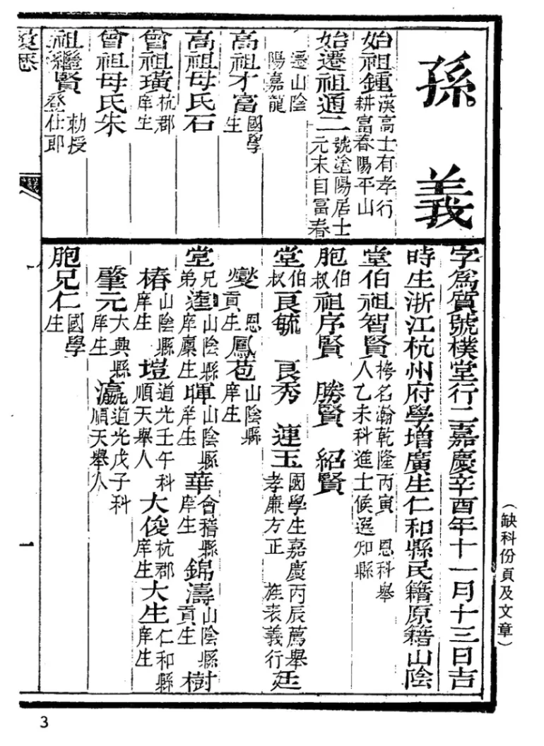 姓名:孙义字:为质号:朴堂出生时间:嘉庆辛酉年十一月十三日吉时(即1801年12月)籍贯:浙江杭州府学增广生,仁和县民籍,原籍山阴