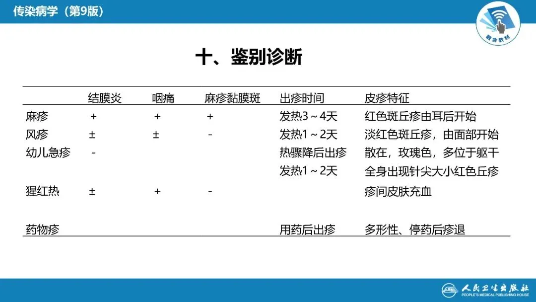 PPT 中还包含麻疹与风疹、幼儿急疹等疾病的鉴别表格,将核心鉴别要点直观呈现,更标注了隔离时限、疫苗接种等防控关键细节,干货满满,省去医护人员和医学生大量整理资料的时间,兼顾理论学习与临床应用。