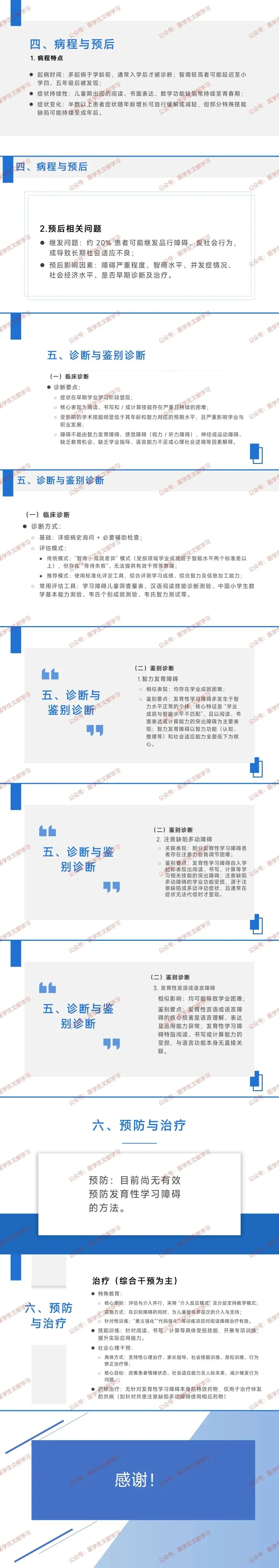 诊断要点:症状在早期学业学习阶段显现;核心表现为阅读、书写和 / 或计算技能严重且持续困难;学术技能明显低于年龄和智力对应的预期水平,影响学业与职业发展;障碍不能由智力发育障碍、感觉障碍等因素解释。