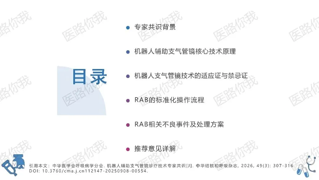 然而,临床应用的标准化与规范化亟待统一。为此,中华医学会呼吸病学分会联合国内多学科专家,基于多中心研究与循证医学证据,制定了《机器人辅助支气管镜诊疗技术专家共识》(发表于《中华结核和呼吸杂志》2026年第49卷第3期)。本文将对该共识进行系统性梳理,重点解读核心技术、操作规范及并发症管理,为临床安全开展RAB技术提供参考。