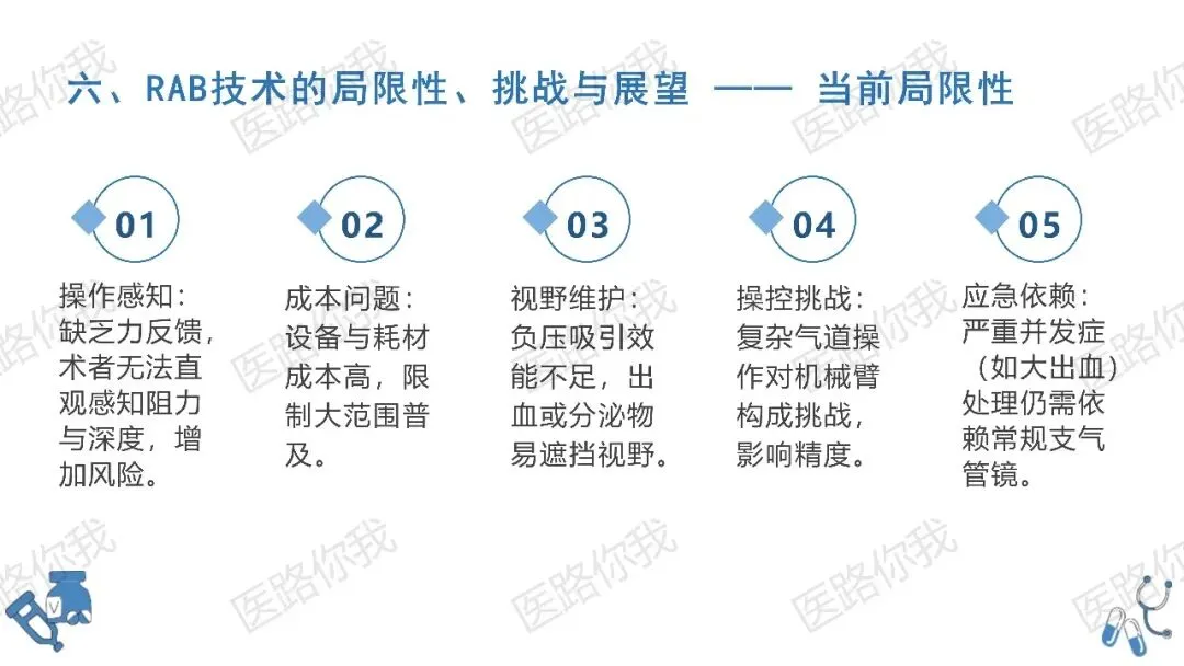 尽管前景广阔,RAB仍面临设备成本高、缺乏力反馈(触觉)、复杂气道操控难度大等挑战。未来的技术迭代将聚焦于AI自动巡航、多模态影像实时融合及微型化治疗工具的开发。参考文献:中华医学会呼吸病学分会. 机器人辅助支气管镜诊疗技术专家共识[J]. 中华结核和呼吸杂志, 2026, 49(3): 307-316.
