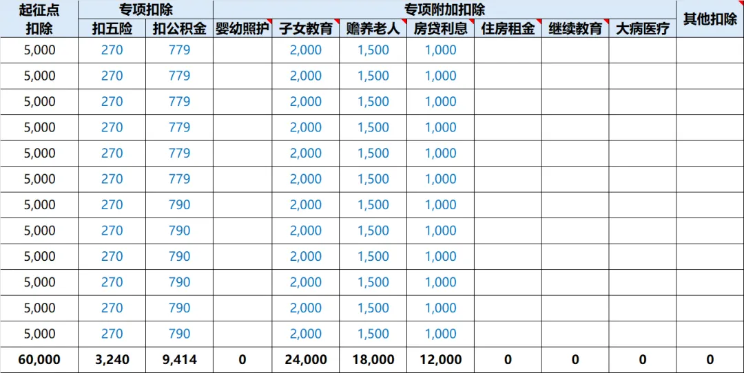 3、各项扣除:起征点、专项、专项附加、其他等: