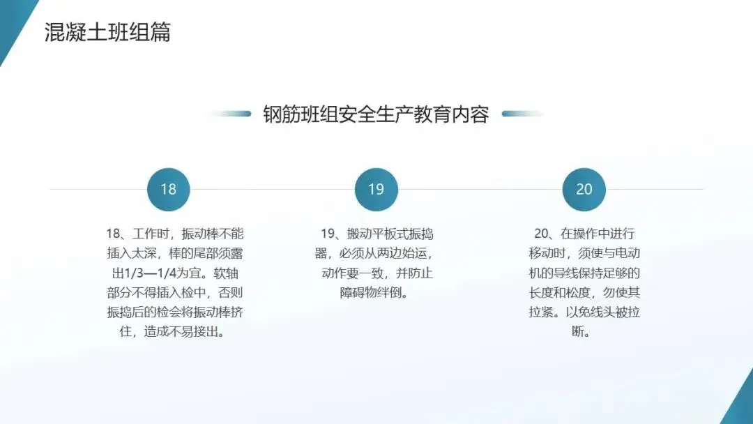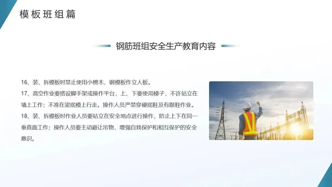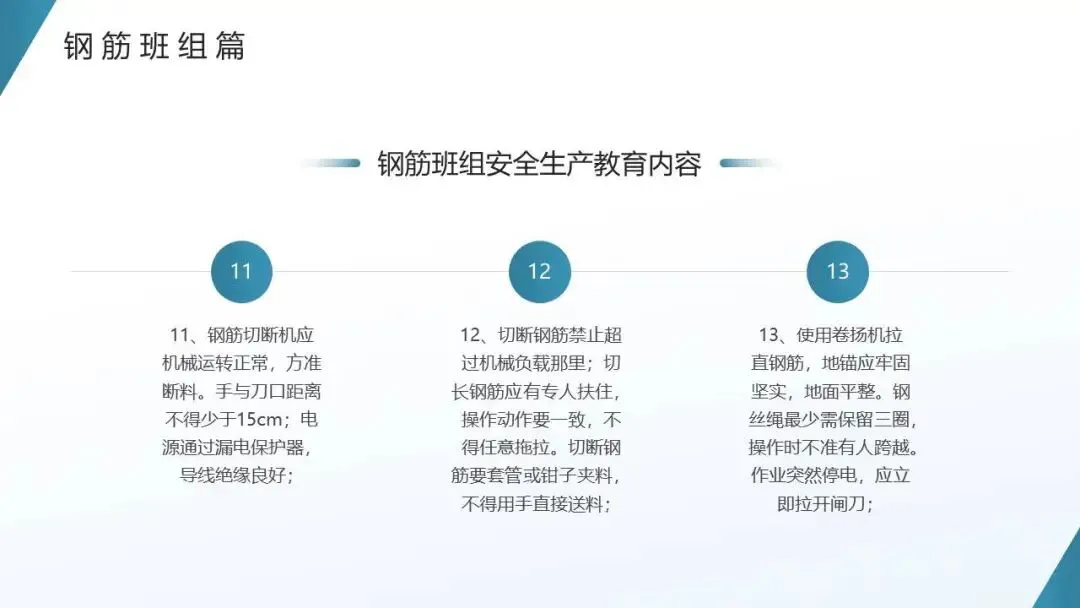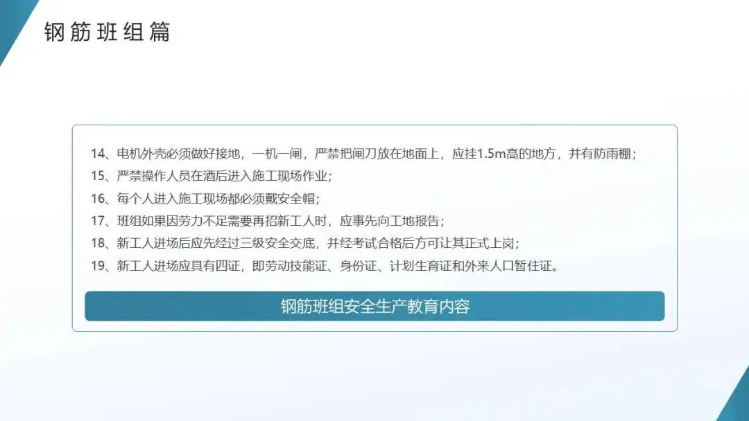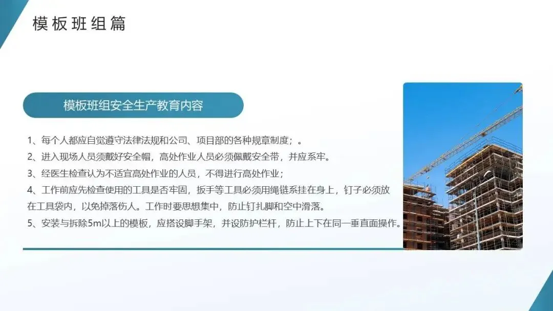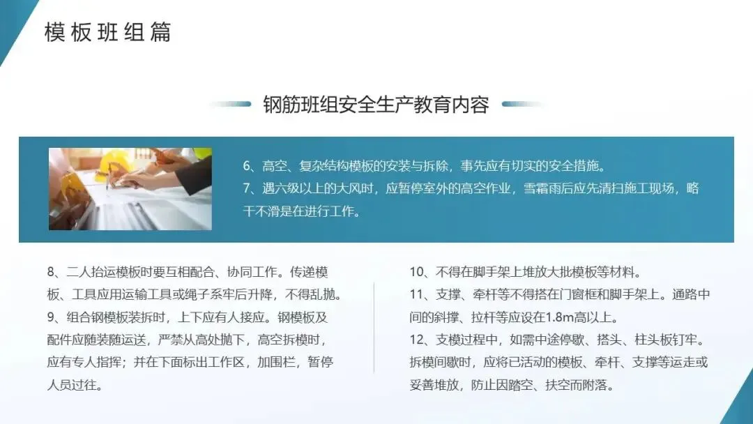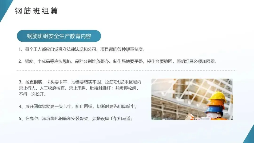 建筑工地各班组安全教育培训重点针对四个主要班组——钢筋班组、模板班组、混凝土班组和架子班组——分别制定了详细的安全操作规范与注意事项,旨在提升一线作业人员的安全意识和自我保护能力。具体内容概括如下: