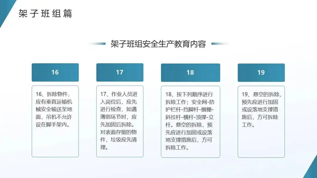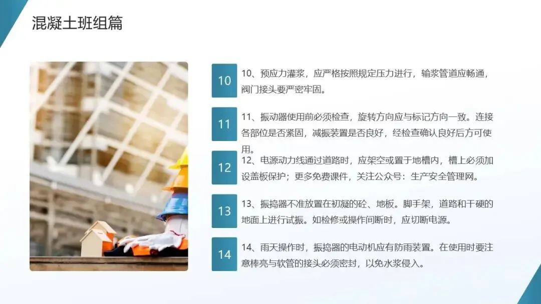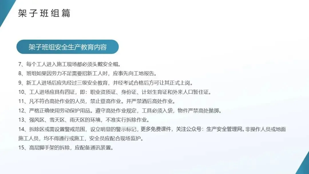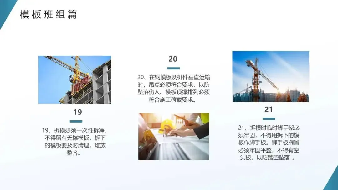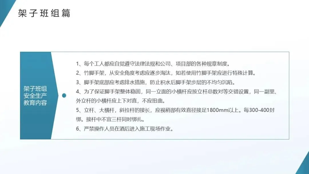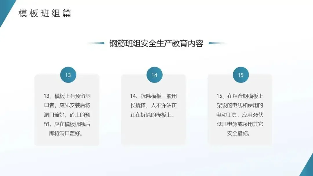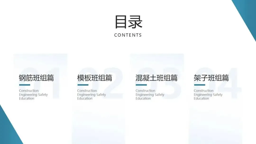 建筑工地各班组安全教育培训重点针对四个主要班组——钢筋班组、模板班组、混凝土班组和架子班组——分别制定了详细的安全操作规范与注意事项,旨在提升一线作业人员的安全意识和自我保护能力。具体内容概括如下: