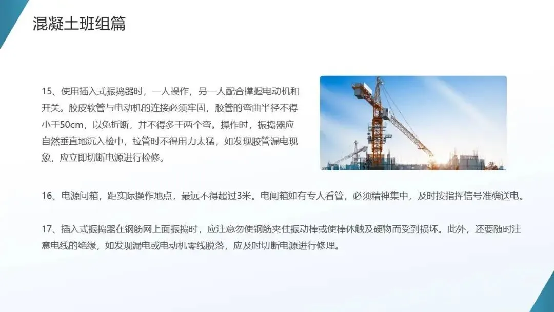 重点规范插入式振捣器的使用:一人操作,一人配合控制开关,胶管弯曲半径不小于50厘米,避免漏电。电源箱距作业点不超过3米,设专人看管。振捣时防止钢筋夹住振动棒或损坏设备,发现漏电或零线脱落立即断电检修。