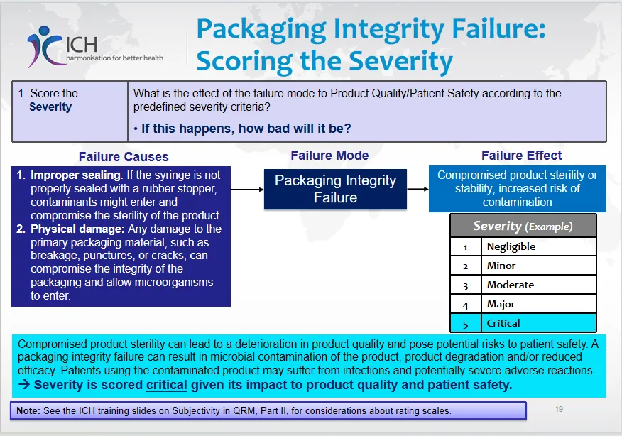 2.评分与决策流程(以无菌注射器包装完整性失效为例):- 步骤1:评分严重性 - 评估失效影响对产品质量/患者安全的严重程度(例如:1-5分,5为“关键”)。示例中,包装完整性失效可能导致产品污染和患者感染,严重性评为“关键”。