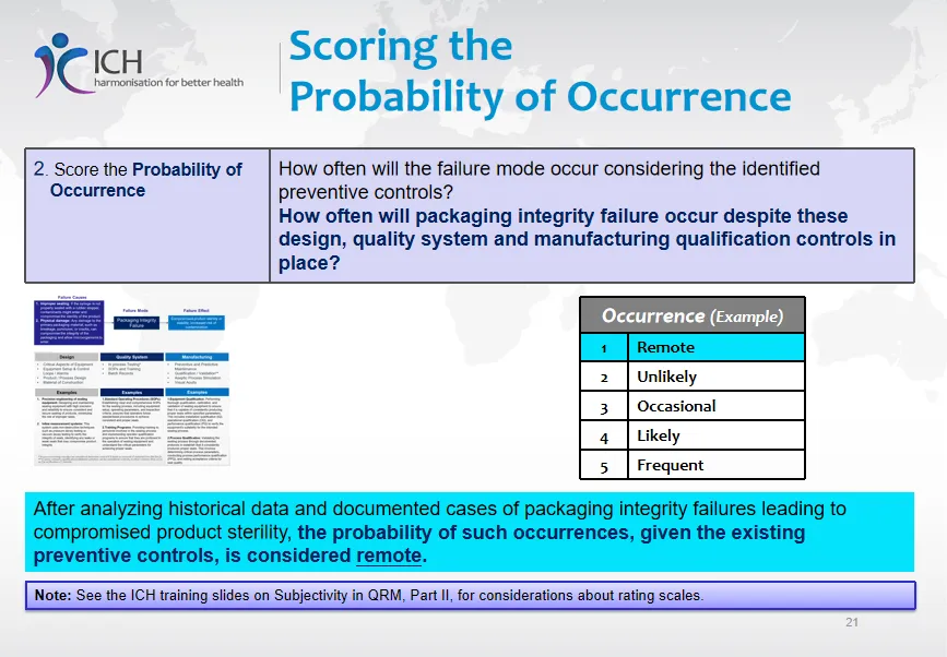 - 步骤2:评分发生概率 - 在考虑现有预防控制下,失效模式发生的可能性(例如:1-5分,1为“极少”)。示例中,由于有精密封设备、SOP、验证等控制,发生概率评为“极少”。