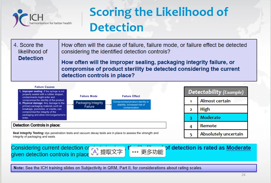 - 步骤4:评分可检测性 - 在考虑现有检测控制下,失效被检测出来的可能性(例如:1-5分,1为“几乎肯定”)。示例中,现有密封完整性测试(如染料渗透测试)使可检测性评为“中等”。