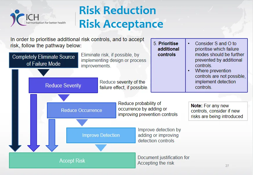 - 风险降低和接受的优先路径是:完全消除失效源 → 降低严重性 → 降低发生概率(增加预防控制)→ 提高可检测性(增加检测控制)→ 接受风险。