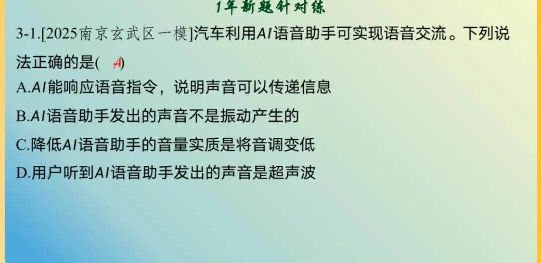 - 搭配1年新题针对练(如AI语音助手相关真题),直击“声音传递信息、声音的产生条件、噪声控制”三大必考题型。