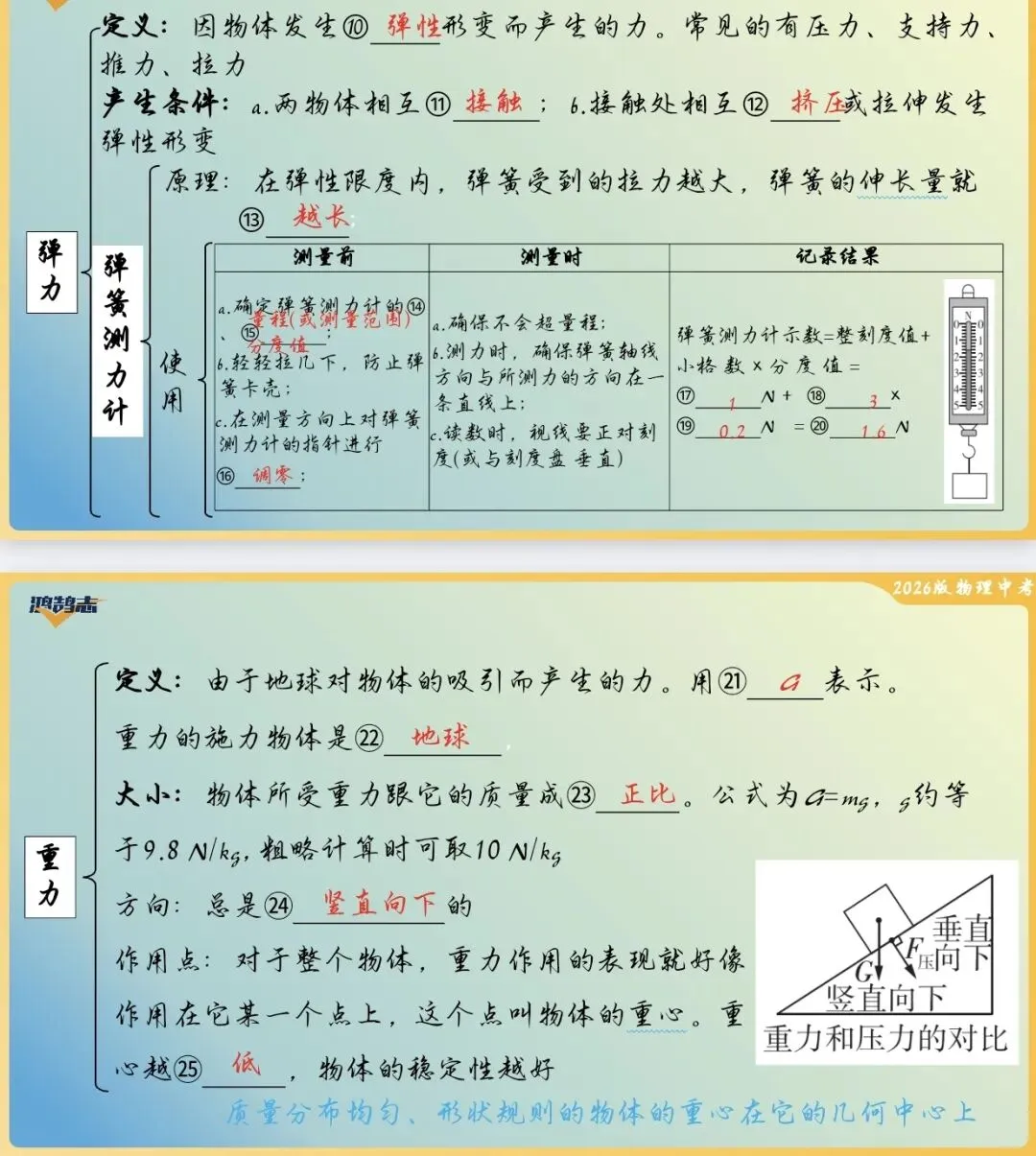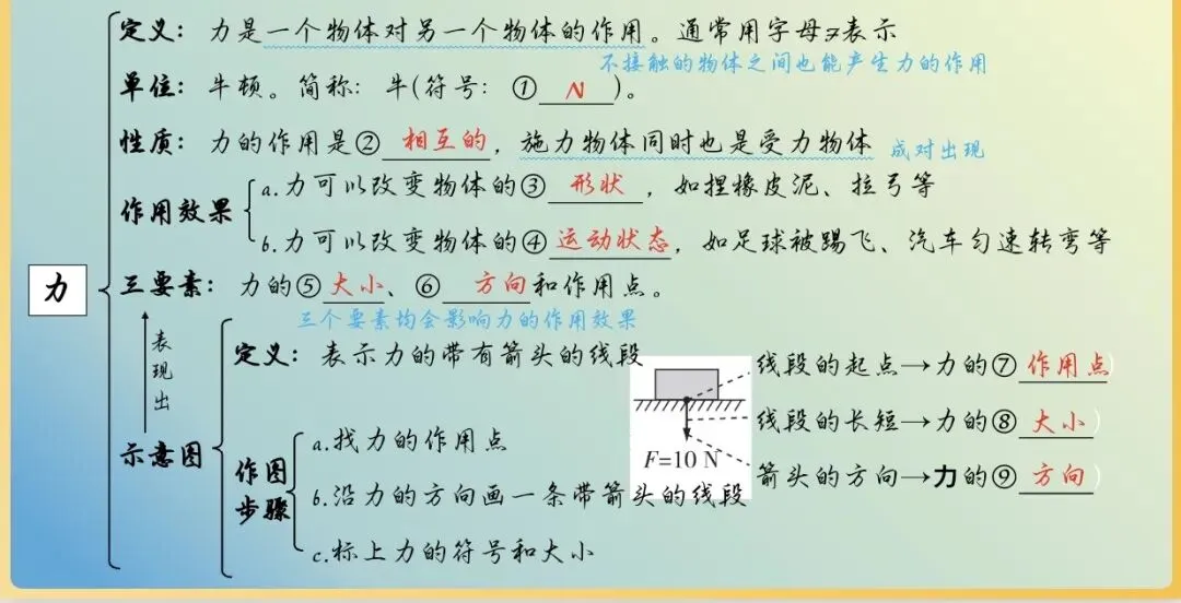 - 必背:重力公式(G=mg)、摩擦力的影响因素、力的作用效果;