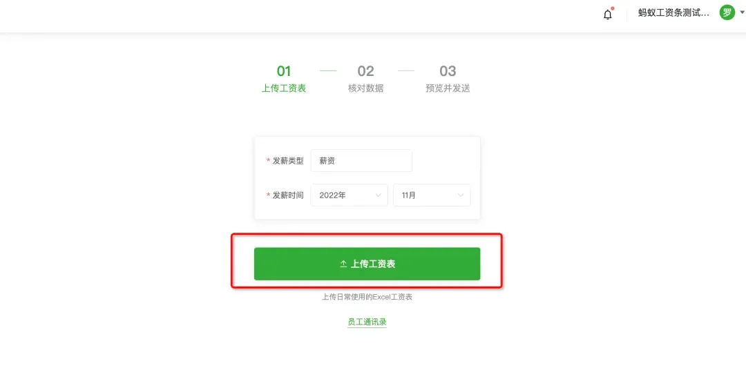 步骤三:点击【上传工资表】,上传日常使用的EXcel工资表。