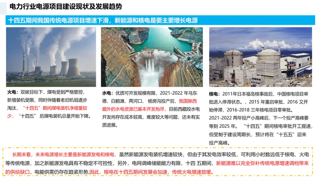 “十四五” 期间,传统电源增速放缓:火电新增装机受限、老旧机组淘汰;水电优质资源开发殆尽;核电审批提速但受建设周期制约。未来电源增长核心为新能源与核电,但新能源存在不稳定、效率低等问题,火电仍将发挥调峰作用,智慧电厂成为建设核心目标。