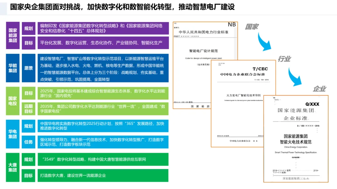 国家能源集团、华能、国电投等央企纷纷出台数字化转型战略,通过 “平台化发展、数字化运营”,打造智慧电厂示范项目,目标 2025 年实现行业领先、2035 年达到世界一流。