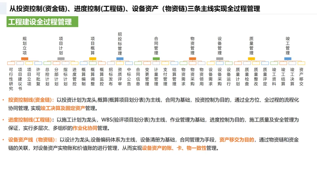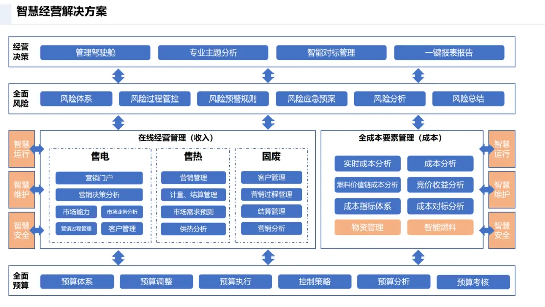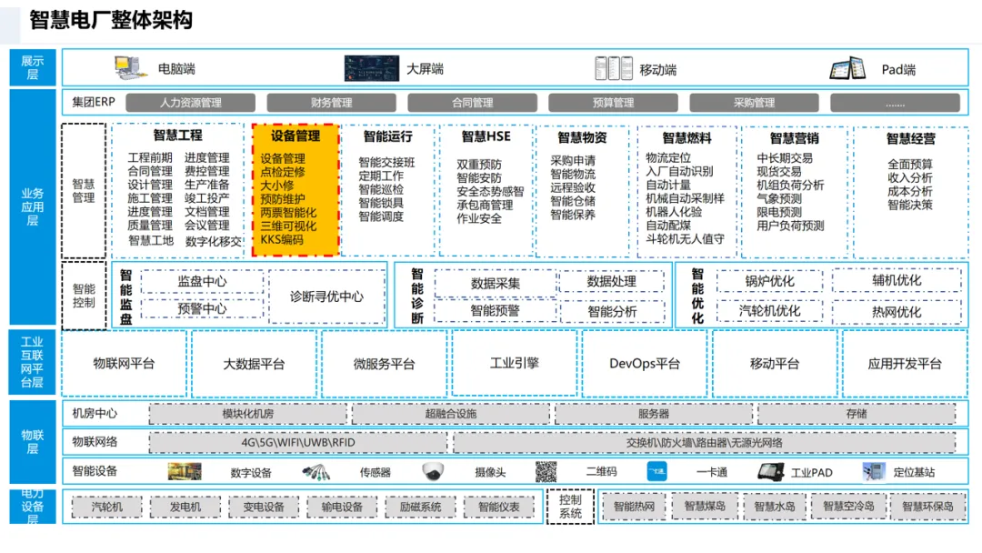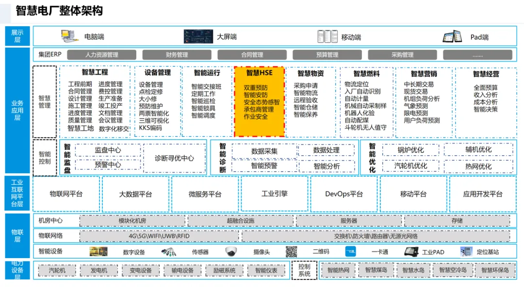 工程管理实现 “资金链、工程链、物资链” 三线管控;设备管理通过 KKS 编码、智能两票等技术实现全生命周期管理;智慧 HSE 依托 AI 安防、人员定位打造本质安全;智慧燃料通过无人值守、数字煤场实现全流程自动化;智慧经营构建营销、成本、决策一体化体系。