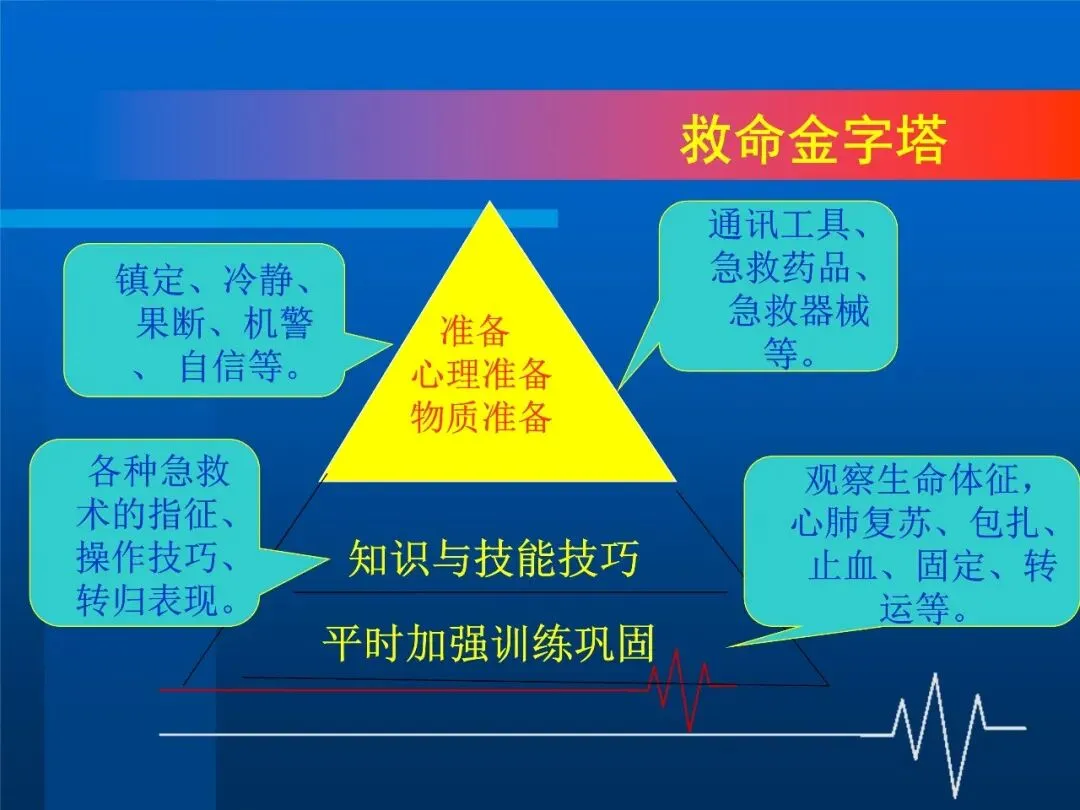 这份 PPT 由专业讲师打造,内容覆盖创伤急救全流程核心知识点,从创伤定义、救命金字塔的准备要点,到 ABCDE 优先处理原则的实操应用,逐一拆解创伤检查、止血包扎、固定搬运的标准操作,详解指压止血、加压包扎等多种止血方法的适用场景与注意事项,还有骨折、软组织损伤的现场处理技巧。