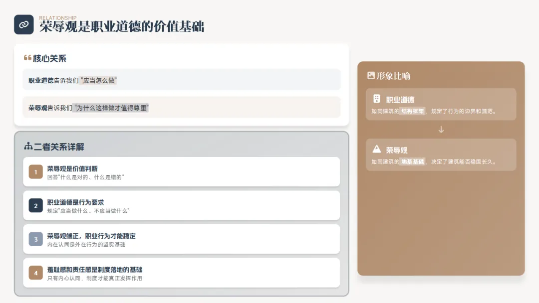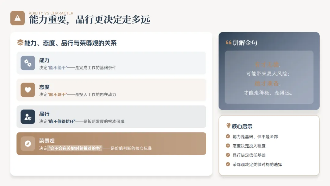 能力是基础,但不是全部。品行决定了你的信任基础,而荣辱观决定了你在关键时刻的选择。很多时候,一个错误的选择,不是因为能力不足,而是因为荣辱观偏差。