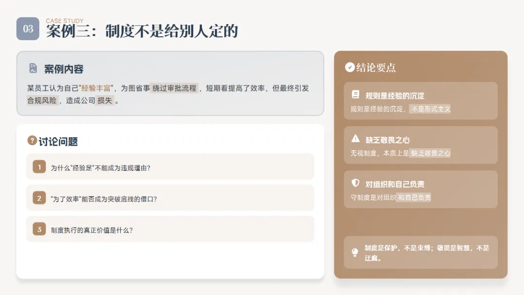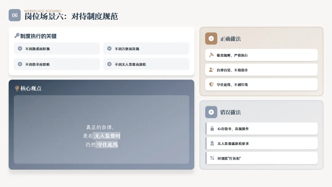 面对公司的规章制度,你是遵章守纪、令行禁止,还是认为"制度是死的,人是活的",随意变通甚至违反?