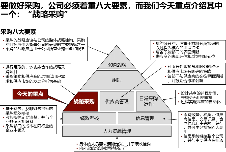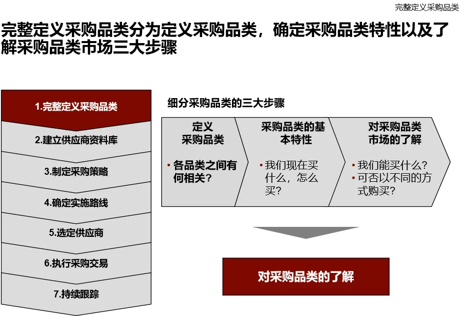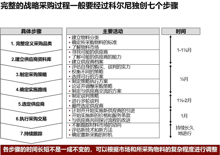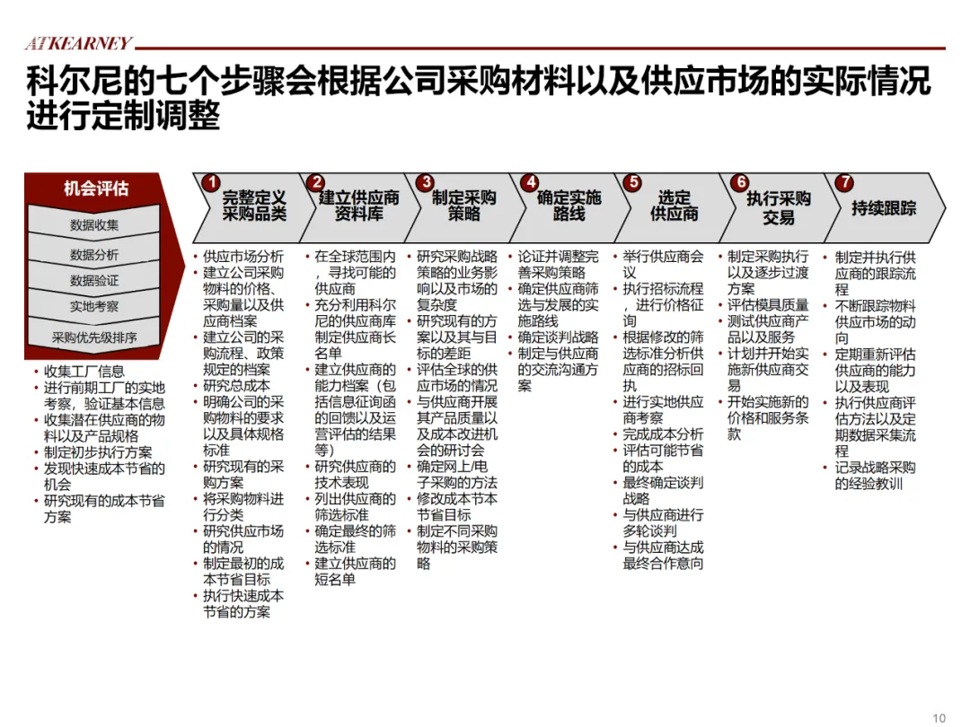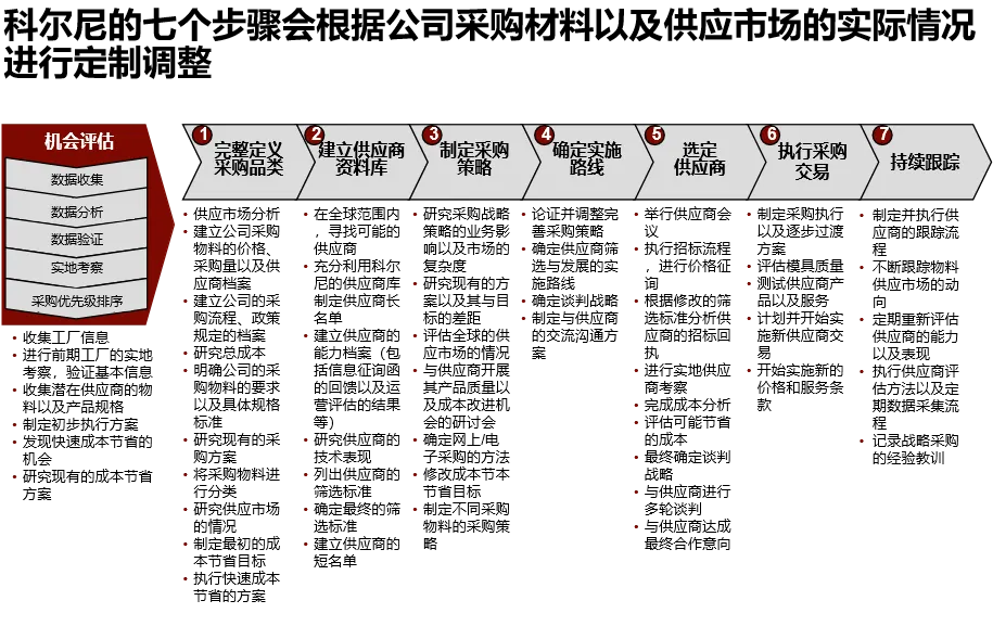 在当今竞争激烈的商业环境中,企业如何通过采购管理实现成本优化、风险控制和价值最大化,已成为其核心竞争力的关键组成部分。科尔尼咨询公司提出的“七部战略采购法”为这一挑战提供了系统化的解决方案。该方法通过七个紧密衔接的步骤,帮助企业将采购从传统的交易性职能提升为战略性能力,推动供应链的持续优化与创新。