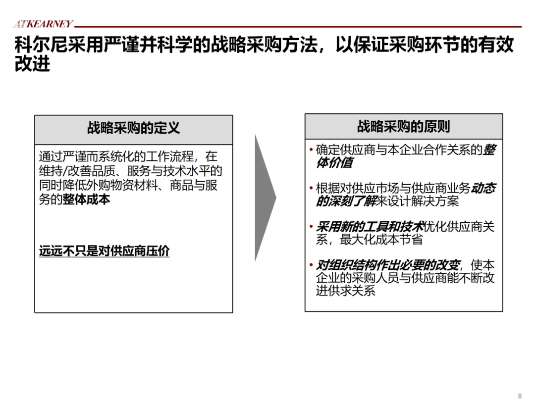科尔尼七部战略采购法通过系统化的步骤,将采购从被动支持职能转变为主动价值创造者。在供应链复杂性日益增加的背景下,该方法不仅帮助企业实现成本节约与风险管控,还通过供应商协同与创新,驱动业务增长。对于致力于构建可持续竞争力的企业而言,深入践行这一方法论,将是其在未来市场中脱颖而出的关键。