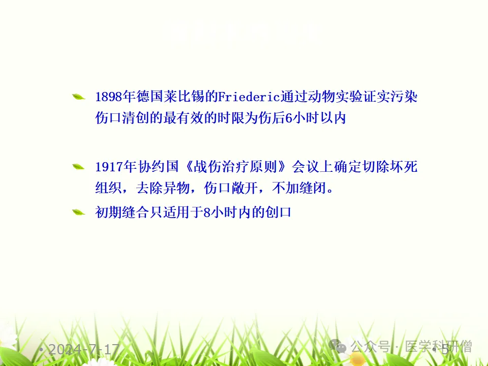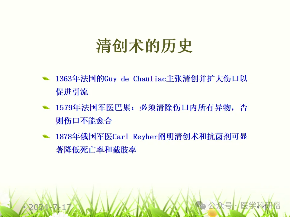 清创术的历史可以追溯到中世纪。1363年,Guy de Chauliac主张清创并扩大伤口以促进引流,这是清创术的初步形成。1579年,法国军医巴累强调必须清除伤口内所有异物,否则伤口不能愈合,这一观点进一步推动了清创术的发展。1878年,Carl Reyher发现清创术和抗菌剂的使用可以显著降低死亡率和截肢率,这标志着清创术进入了新的发展阶段。1898年,Friederic提出污染伤口清创的最有效时限为伤后6小时以内,这一观点对清创术的时机选择产生了重要影响。1917年,协约国《战伤治疗原则》确定了切除坏死组织、去除异物、伤口敞开、不加缝闭的治疗原则,这些原则至今仍是清创术的重要指导。