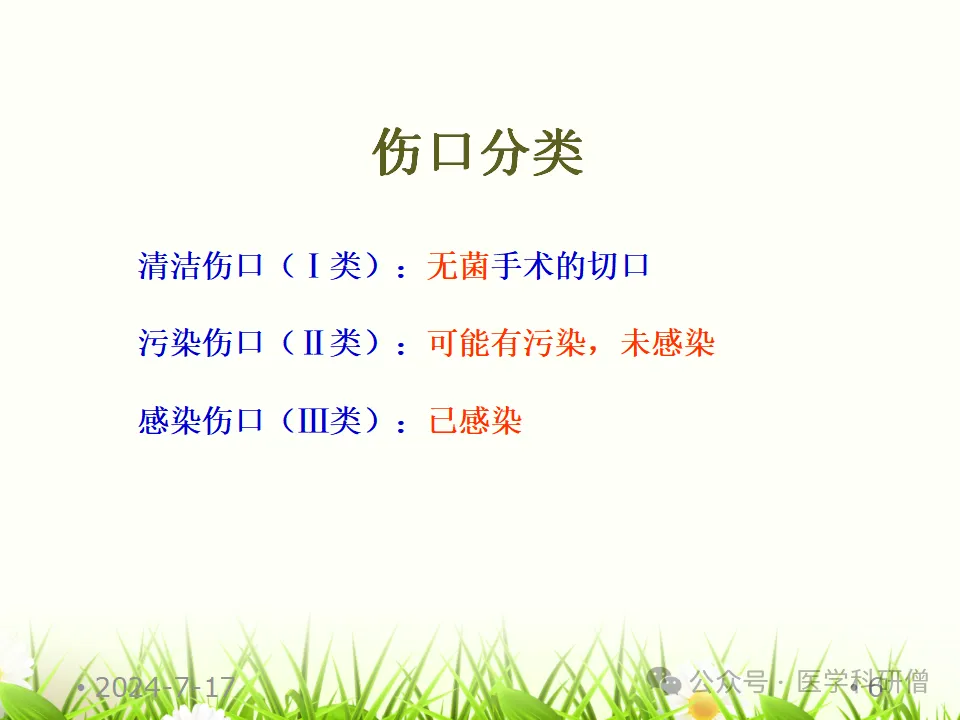 根据伤口的污染程度和感染情况,可以将伤口分为三类:清洁伤口(Ⅰ类)、污染伤口(Ⅱ类)和感染伤口(Ⅲ类)。不同类型的伤口需要采取不同的处理方法和治疗策略。