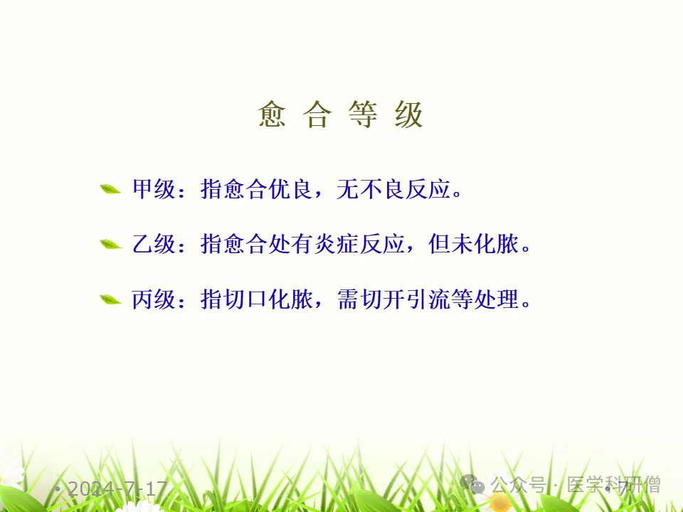 伤口愈合等级是评价伤口愈合质量的重要指标。甲级愈合表示愈合优良,无不良反应;乙级愈合表示愈合处有炎症反应,但未化脓;丙级愈合则表示切口化脓,需要切开引流等处理。了解伤口愈合等级有助于医生更好地评估治疗效果和患者的恢复情况。