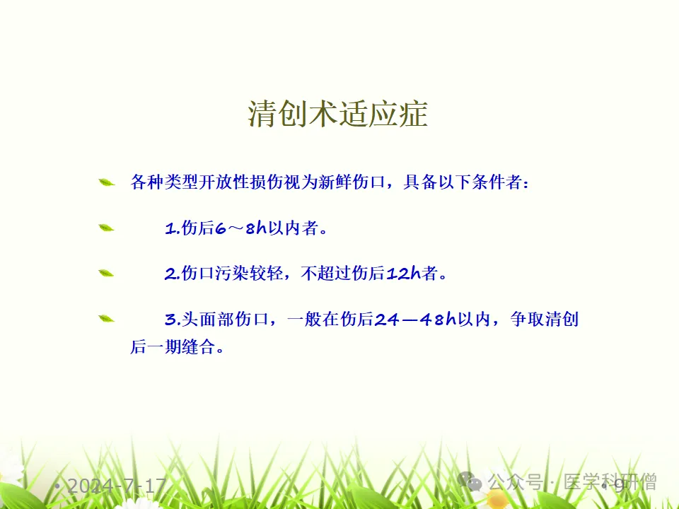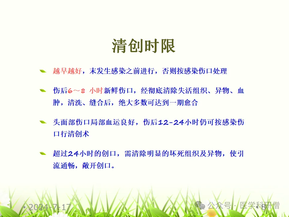 清创时限是指伤口受伤后到进行清创术的时间范围。一般来说,伤后6~8小时内的伤口被视为新鲜伤口,可达到一期愈合。头面部伤口在伤后12-24小时内仍可按感染伤口行清创术。超过24小时的创口,需清除坏死组织及异物,并敞开创口以促进引流和愈合。