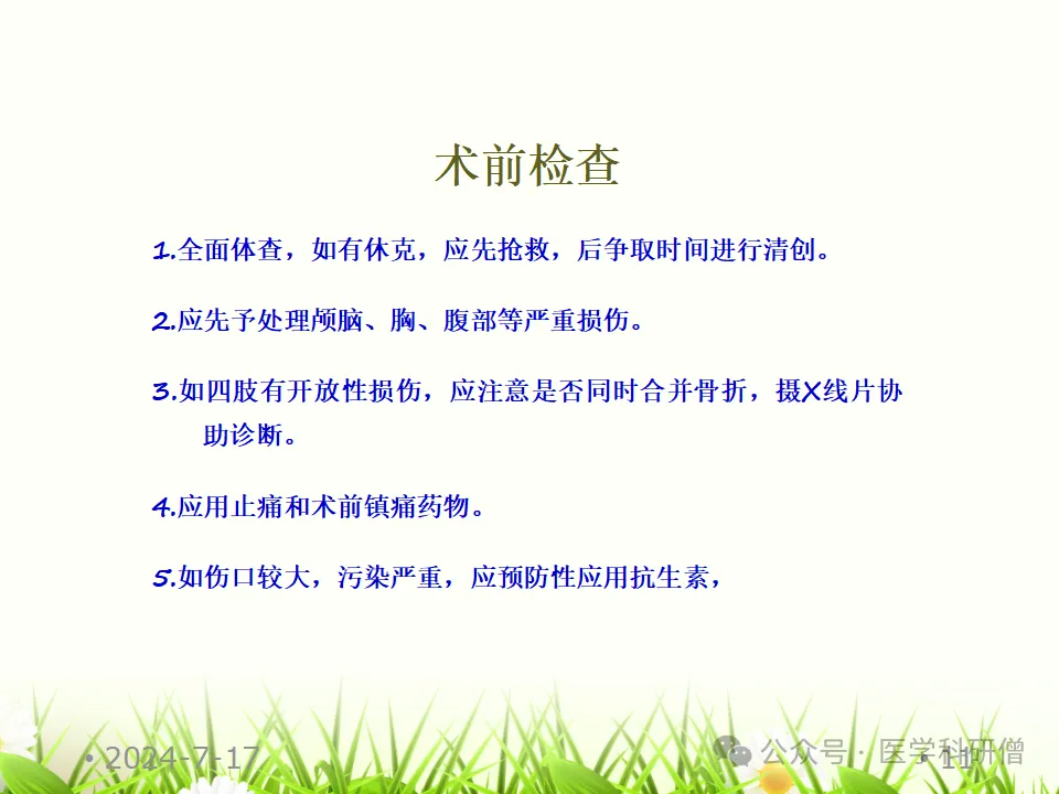 在进行清创术之前,医生需要进行全面的术前检查,包括评估患者的生命体征、处理休克、颅脑损伤、胸腹部损伤等情况,并诊断四肢损伤和应用止痛药物以缓解疼痛。这些检查有助于医生全面了解患者的病情和身体状况,为手术做好充分准备。