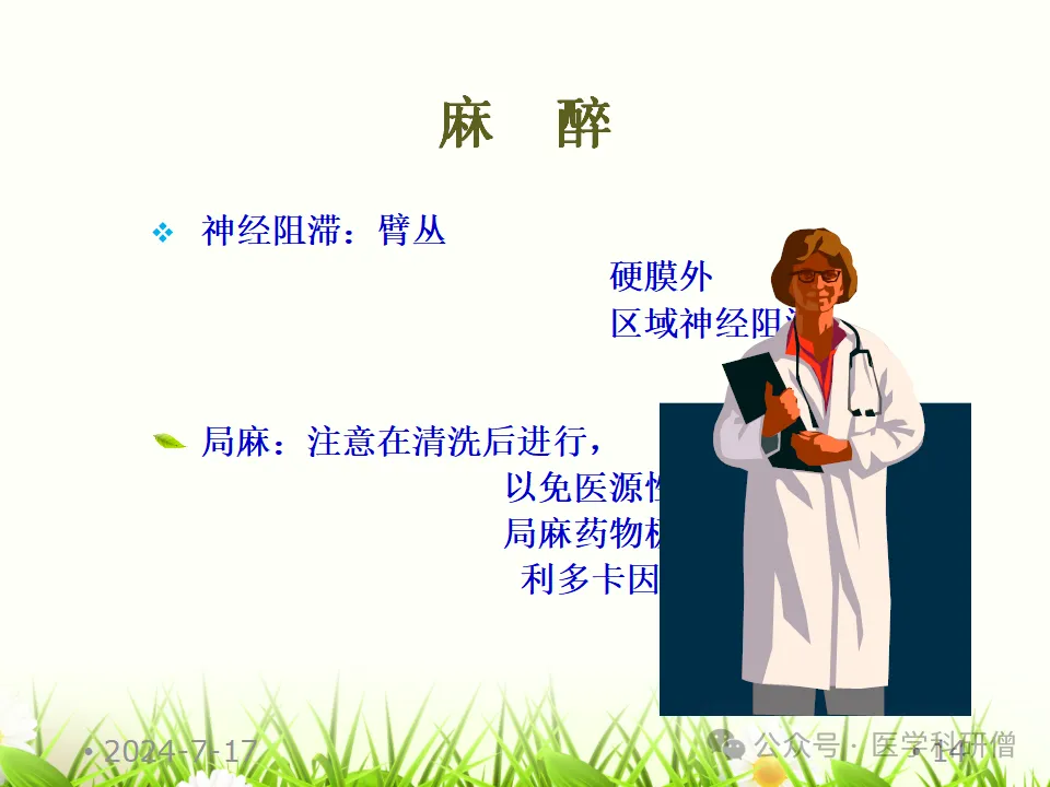清创术通常需要在麻醉下进行以确保手术的顺利进行和患者的舒适度。常用的麻醉方法包括神经阻滞和局麻。神经阻滞适用于较大范围的伤口或需要深度清创的情况,可以通过臂丛、硬膜外或区域神经阻滞等方式实现。局麻则适用于较小范围的伤口或浅表清创的情况,在清洗伤口后进行局部麻醉并注意药物用量以避免过量导致的不良反应。