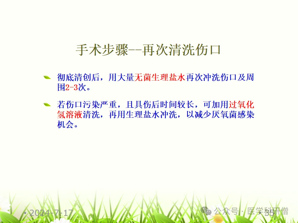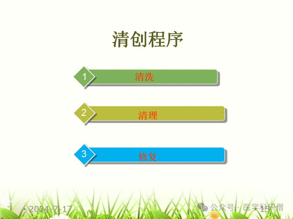 清创程序是清创缝合术的重要组成部分,它主要包括两个关键步骤:清洗皮肤和清洗伤口。首先,使用无菌纱布覆盖伤口周围皮肤,再用无菌毛刷及肥皂液仔细刷洗,以确保皮肤表面的清洁。接着,使用生理盐水冲洗伤口,去除表面的污物和细菌,再用3%过氧化氢溶液冲洗,以进一步杀菌和清洁伤口。