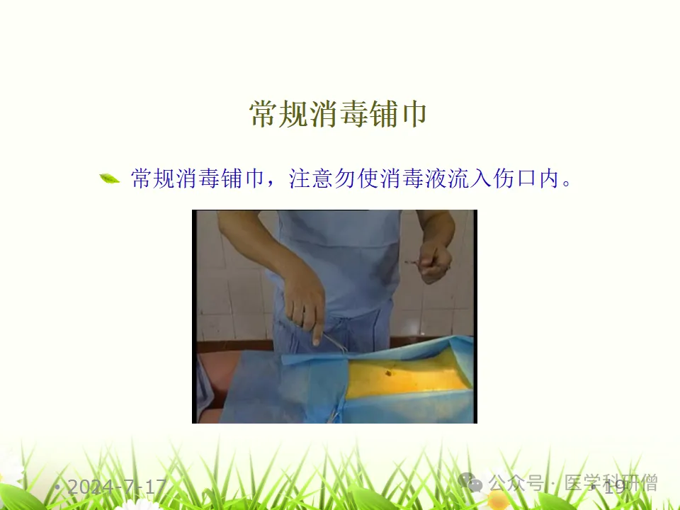 2. 消毒铺巾:常规消毒并铺巾,注意确保消毒液不流入伤口,以避免对伤口造成刺激或损伤。