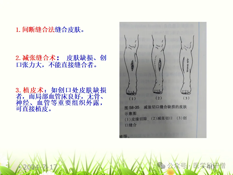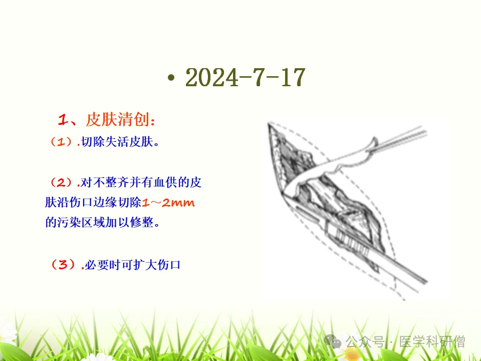 3. 皮肤清创:切除失活的皮肤组织,并修整伤口边缘,以确保伤口的整洁和有利于愈合。