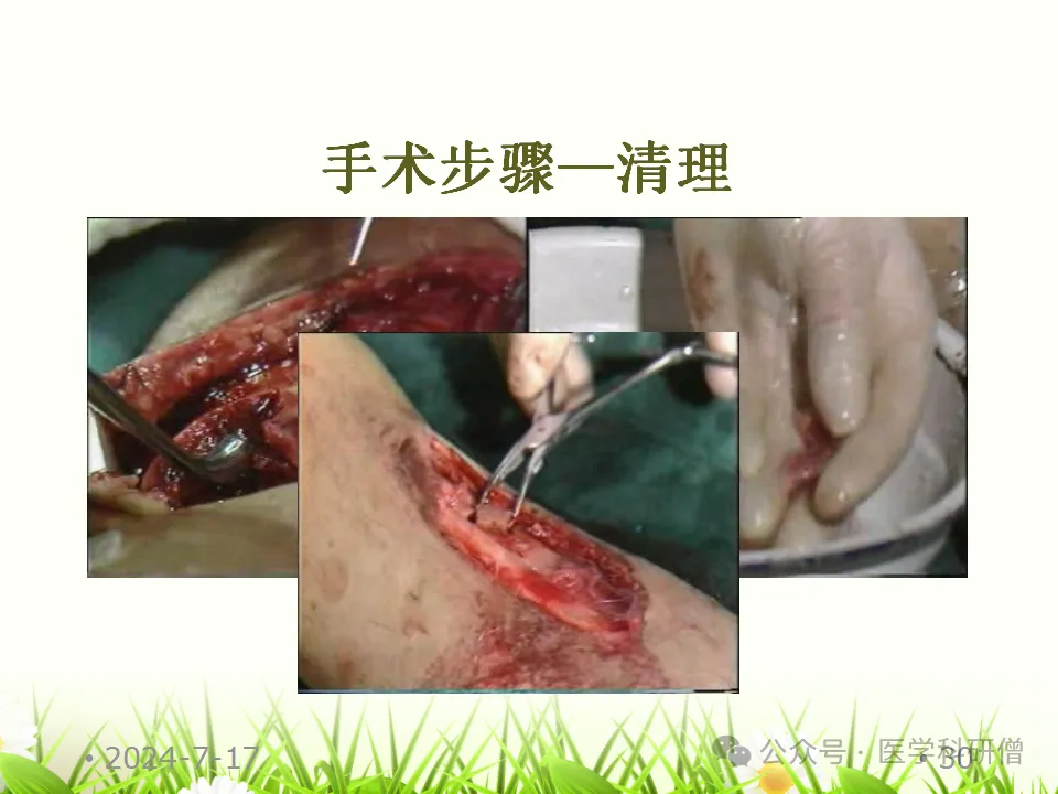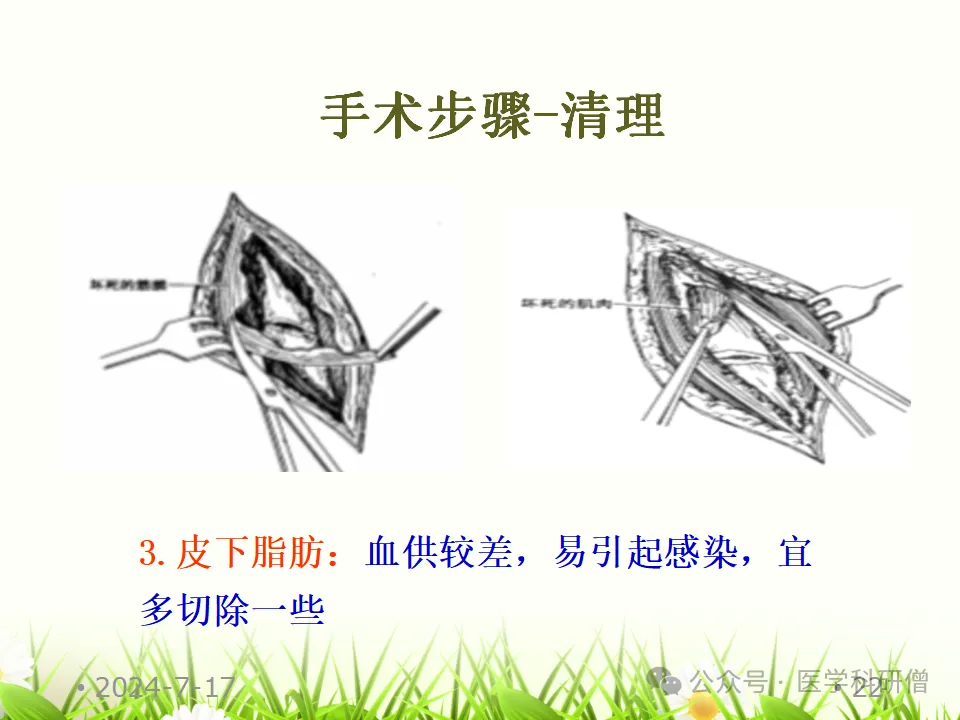 在手术过程中,医生需要特别注意伤口的清洗和组织的处理。清洗伤口是防止感染的关键步骤,必须彻底清除污物和细菌。同时,在切除失活组织时,要仔细辨别组织的活力,尽量保留活力组织,以促进伤口的愈合。