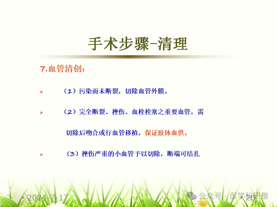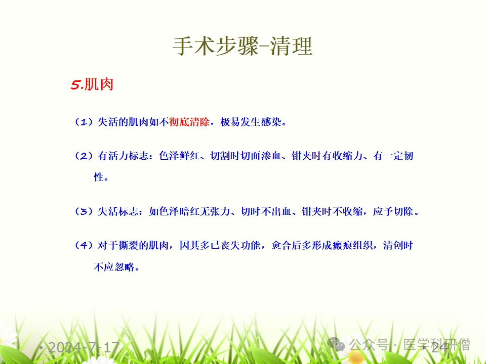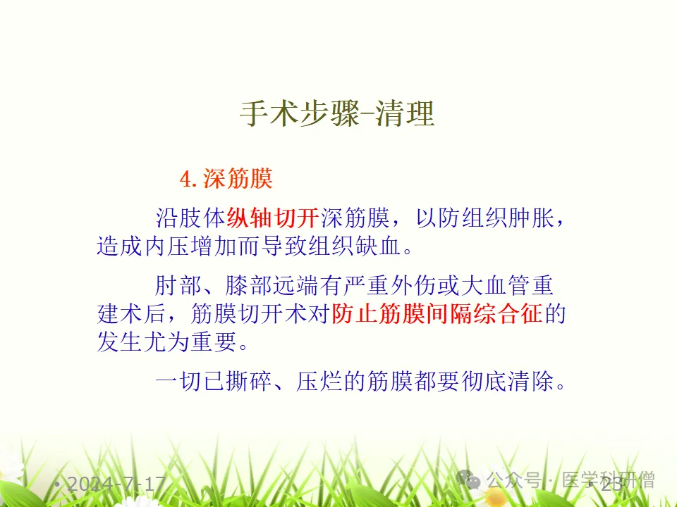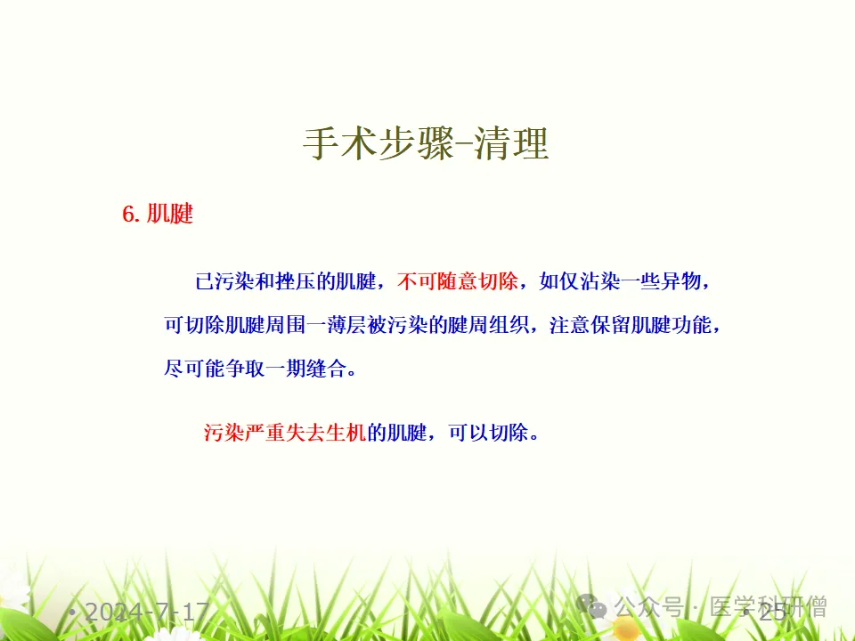 5. 深层组织清创:对皮下脂肪、深筋膜、肌肉、肌腱、血管、神经等深层组织进行清创,去除坏死组织,保留活力组织。