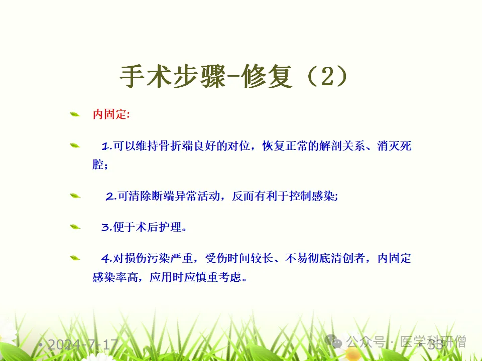 1. 骨折修复:对骨折进行整复,并根据需要进行外固定或内固定,以确保骨折的稳定愈合。