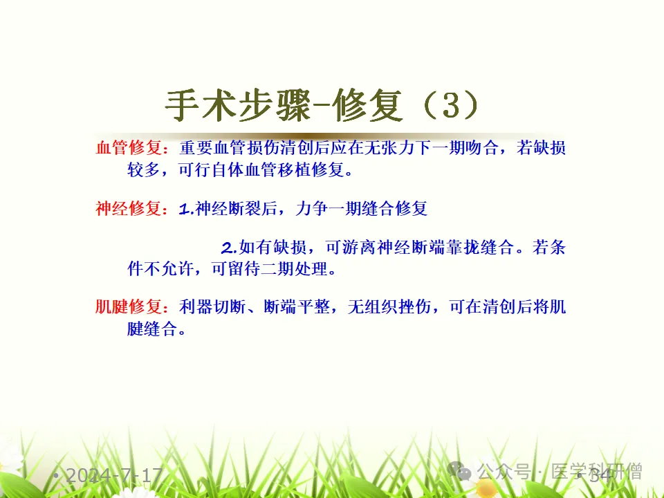 2. 组织修复:对血管、神经、肌腱等组织进行修复,恢复其正常功能。
