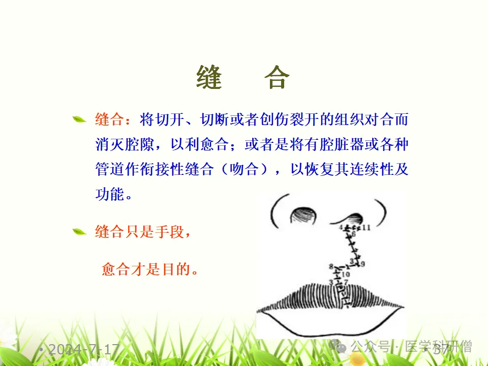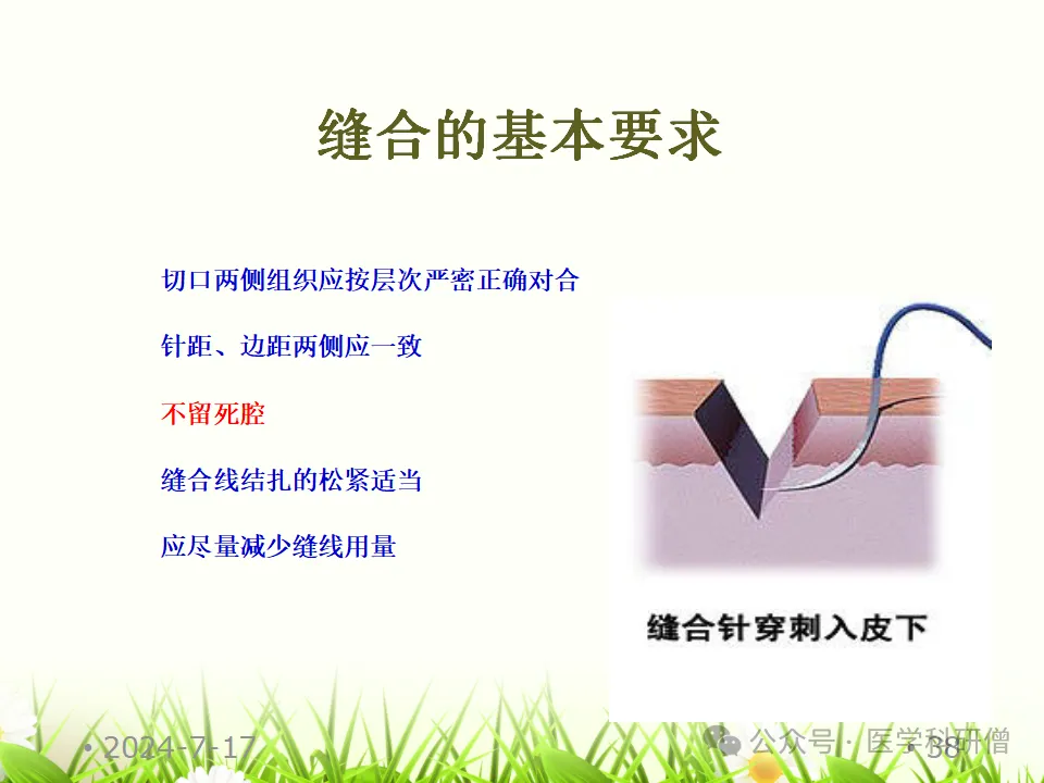 缝合是清创缝合术的最后一步,它要求医生具备精湛的技术和丰富的经验。缝合的基本要求包括组织对合整齐、针距边距一致、不留死腔、结扎松紧适当以及减少缝线用量。常用的缝合方法包括间断缝合、减张缝合、植皮术、延迟闭合以及皮瓣移植术等。