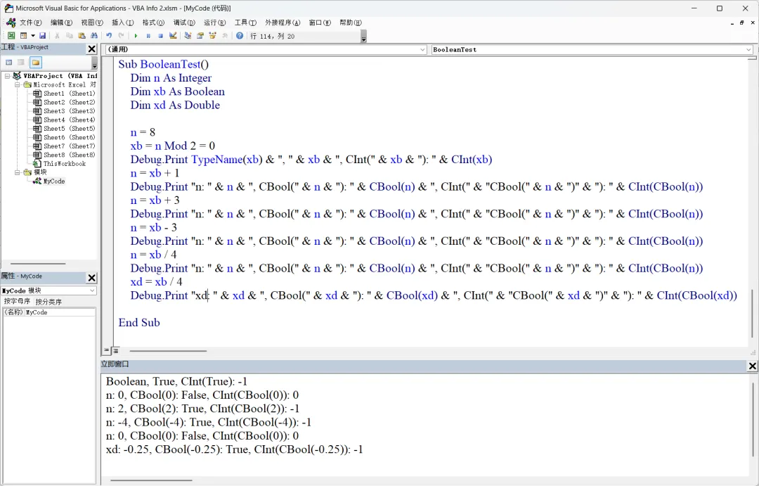 这一长串由 Or 组合起来的布尔表达式(boolean expression),明显不如 Case 2, 3, 5, 7 来得简洁优美。布尔表达式就是求值结果为 True 或 False 的表达式。我们前面已经介绍过,Boolean 类型的值域就是集合 { True, False },并且 VBA 内部用 -1 代表 True,0 代表 False。所以,在将一个算术表达式转换为 Boolean 类型的时候,如果表达式的求值结果为 0,则转换为 Boolean 类型的 False,非 0 则一律转换为 Boolean 的 True,转换以后的内部值是 -1。请见下面的测试例子:这个测试用例说明:所有的算术值(不论是整型还是浮点型)都可以使用 CBool 转换函数转换为 Boolean 类型;而且,根据其值为 True 或 False,分别以其内部表示 -1 或 0,Boolean 类型还可以参与算术运算。Boolean 表达式还可以用 And、Or、Not 等逻辑运算符连接起来组成更复杂的 Boolean 表达式。参见下面的例子。Dim n As Integer...Select Case n Case Is < 0 Debug.Print n & " 是负数" Case 0 to 9 Debug.Print n & " 是小于 10 的非负整数" Case Is >= 10 Debug.Print n & " 是大于等于 10 的整数" Case Else Debug.Print "未知"End Select