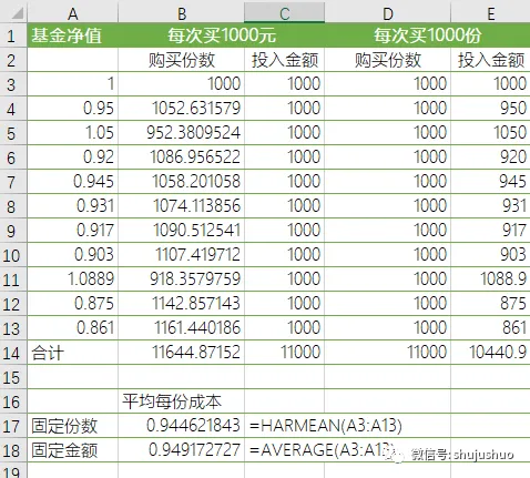 函数的用法和average算术平均值函数是一样的,但结果却差多了。一个经典的案例是计算定投基金成本问题,结果显示按固定份额购买最后成本更低,其实固定份额就是调和平均值,固定金额就是算术平均值。