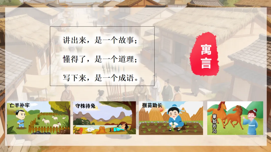 师:有这样一种文体,它讲出来,是一则短小精巧的故事;你读懂了,会明白一个深刻的道理;把它浓缩成四个字,它便是一条大家耳熟能详的成语,这种文体叫“寓言”。