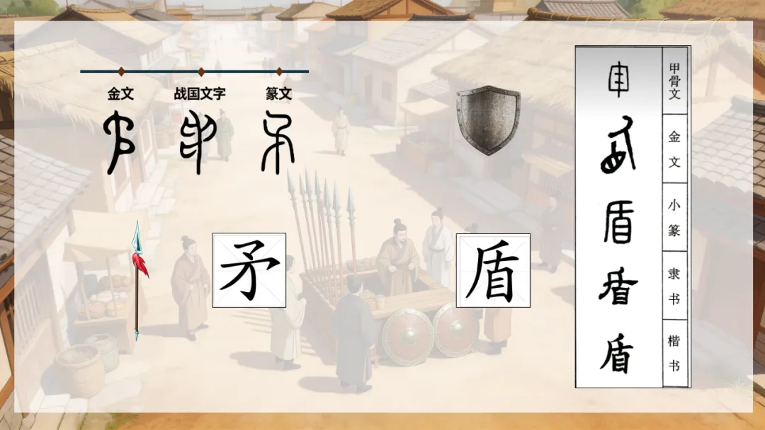 预设:矛和盾。(“矛” 大家看这个字形……“盾”:甲骨文中,……)
