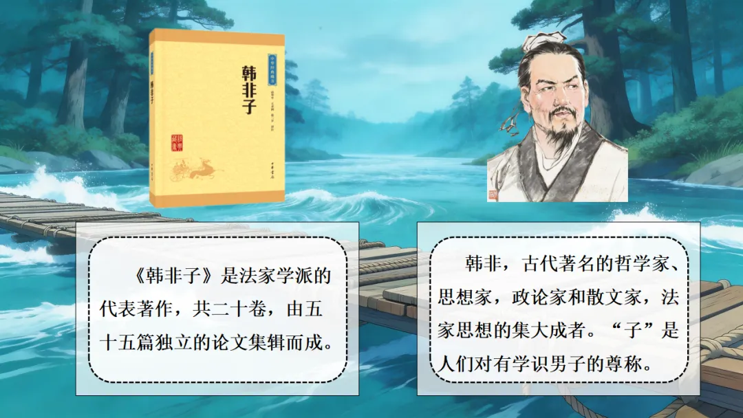 师:《自相矛盾》这个故事,选自《韩非子·难一》,作者是韩非。韩非,古代著名哲学家、思想家、政治家和散文家,是法家思想的集大成者。(出示补充资料)。《韩非子》是法家学派的代表著作,由五十五篇独立的论文集辑而成,对后世影响深远,《韩非子·难一》是其中一篇。