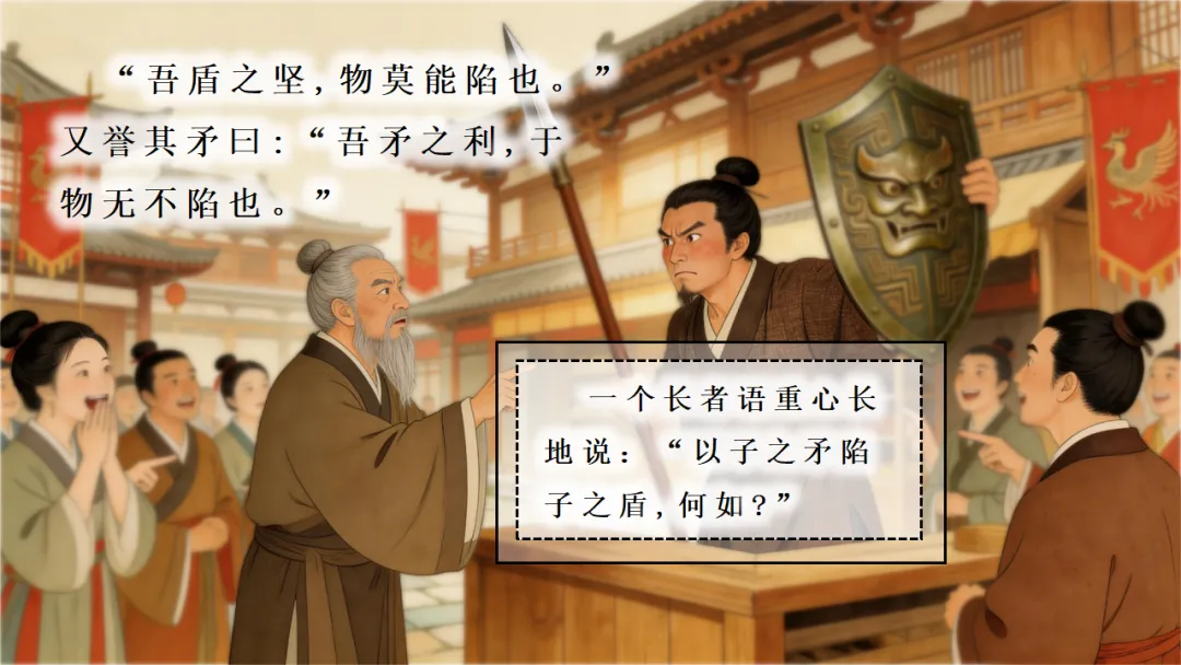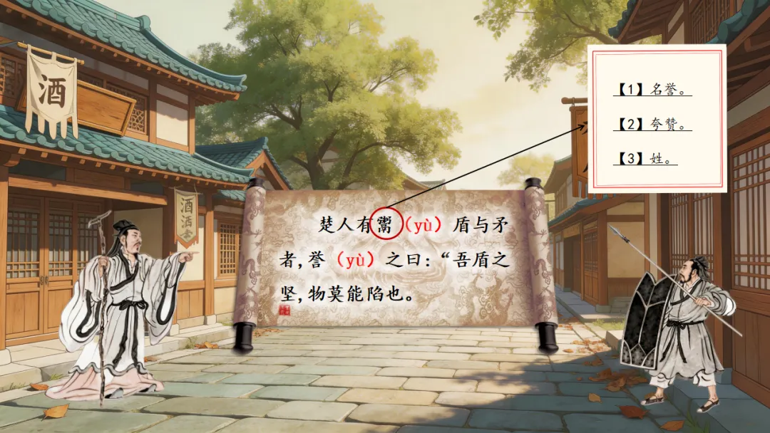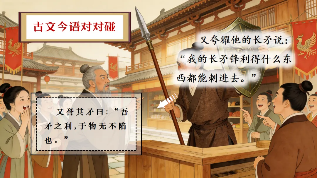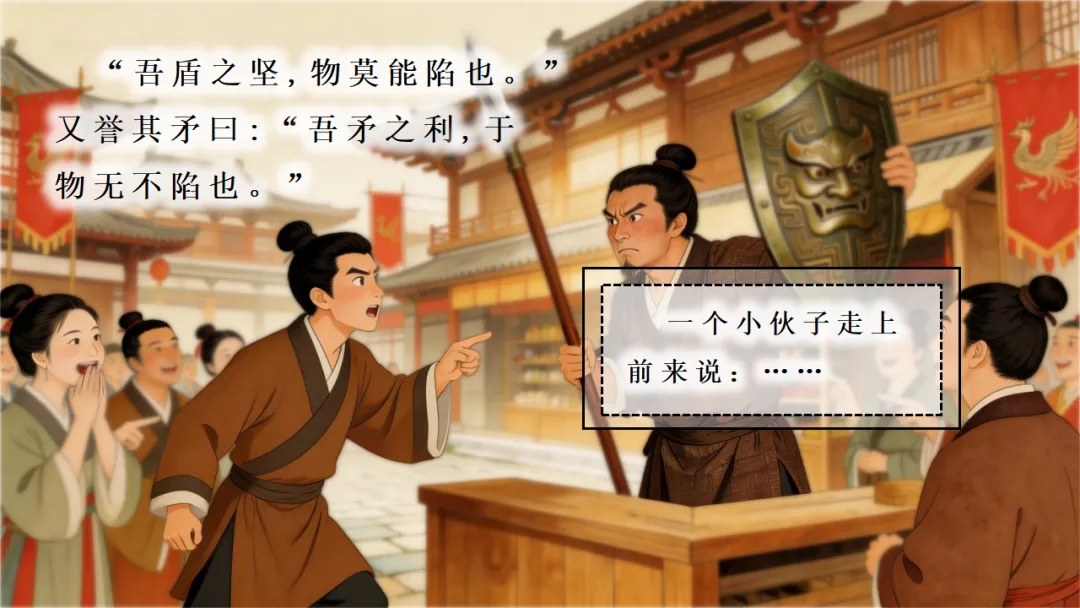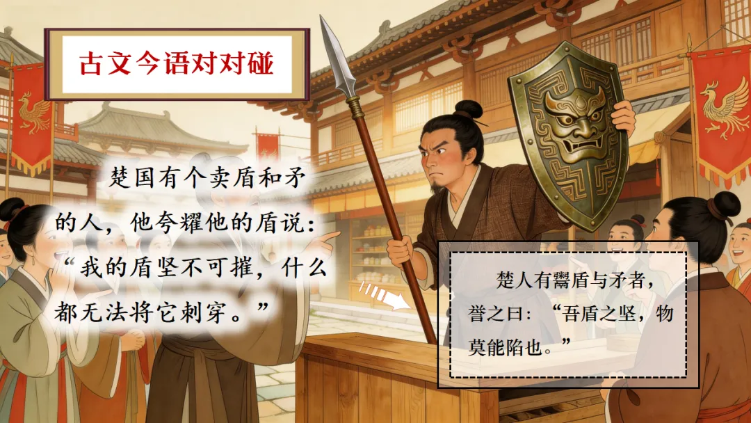 师:时光的年轮载着我们回到两千多年前的楚国集市上,这里上人来人往,热闹非凡,一个卖盾和矛的人为了招揽生意,大声吆喝——(课件出示句子,引1组读)