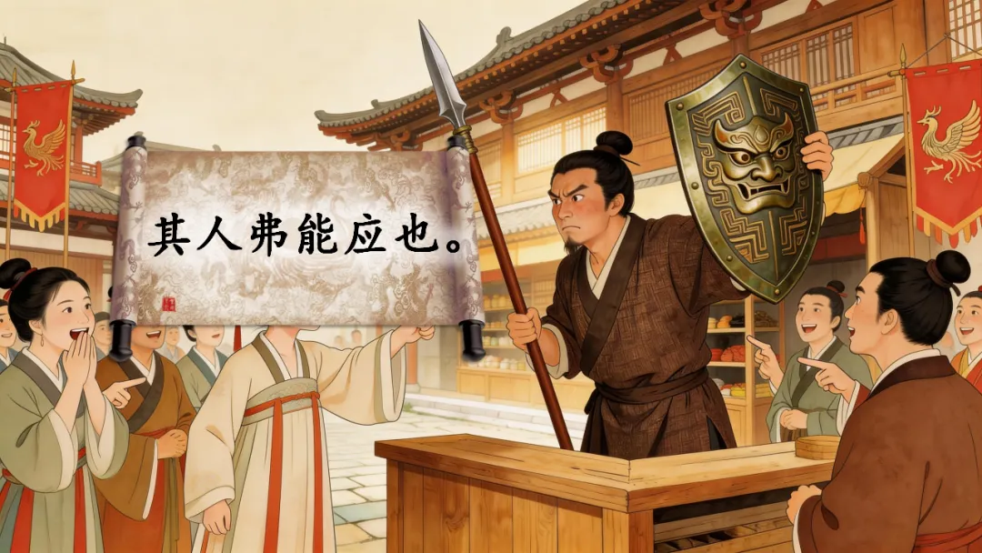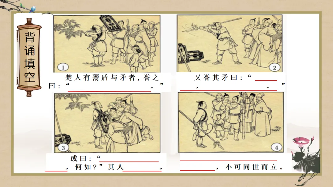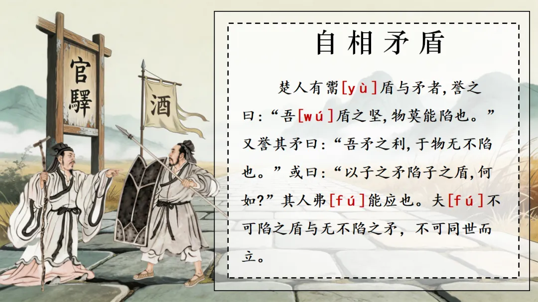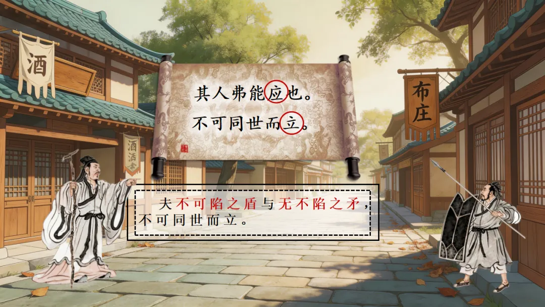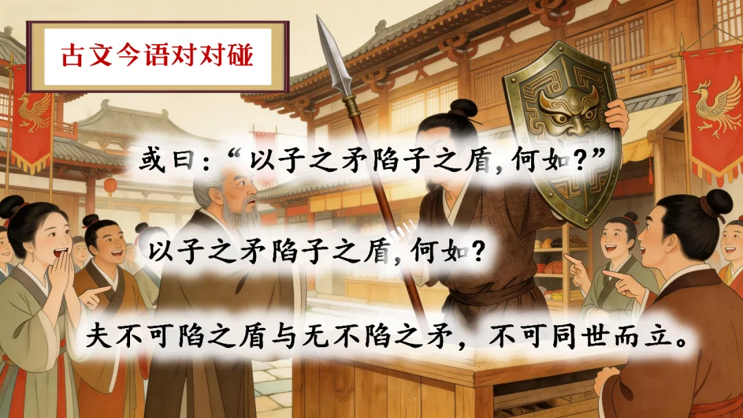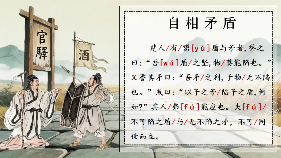 师:时光的年轮载着我们回到两千多年前的楚国集市上,这里上人来人往,热闹非凡,一个卖盾和矛的人为了招揽生意,大声吆喝——(课件出示句子,引1组读)