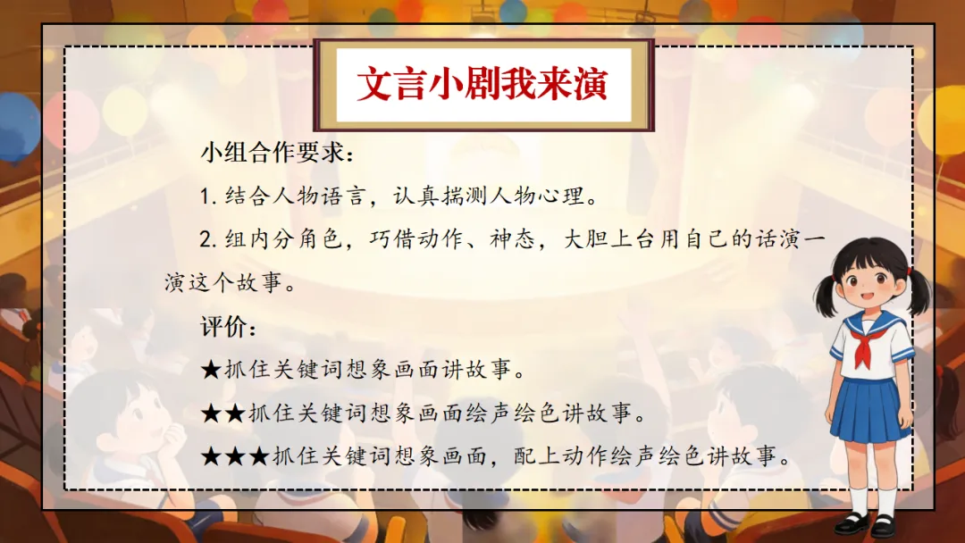 师:瞧!读着读着,故事的趣味尽显其中。光读呀,老师觉得还不过瘾,咱们来演一演。小组合作学习,排练课本剧。