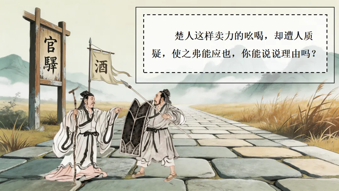 师:楚人这样卖力的吆喝,却遭人质疑,使之弗能应也,你能说说理由吗?(同桌间相互说说)